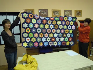 Ve středu jsme měli v Teplicích babinec,chystali jsme výstavu.Bude v květnu při zahájení lázeňské sezony.Minulý rok jsme na výstavě sešívaly kytičky pro Ivu Chovancovou.Kytiček se sešlo dost,do přátelského quiltu mohla být od každé jenom jedna.Irena dostala nápad,že bychom si mohly ušít naši malou teplickou babiččinu zahrádku.Během roku jsme došily ještě další kytičky.Teď se holky důchodkyně scházely v klubovně celý měsíc a sešívaly je dohromady.Eva vymyslela kytičkový lem,bude to moc hezké.